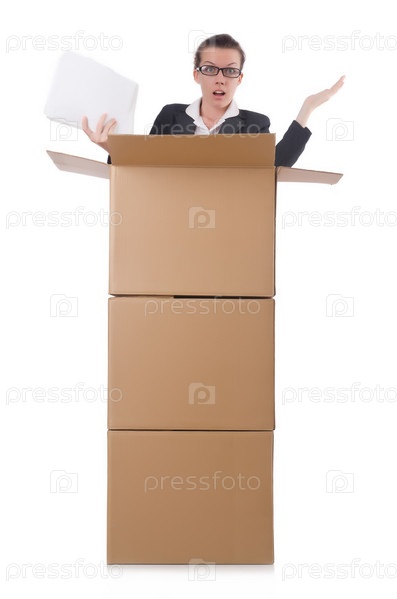 Бизнес-леди в коробке на белом фоне