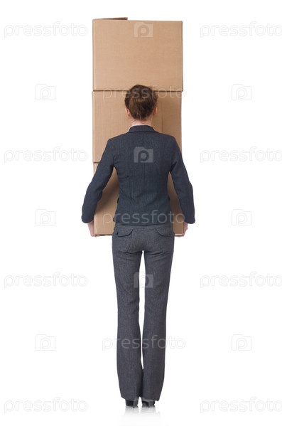 Бизнес-леди с коробками на белом фоне