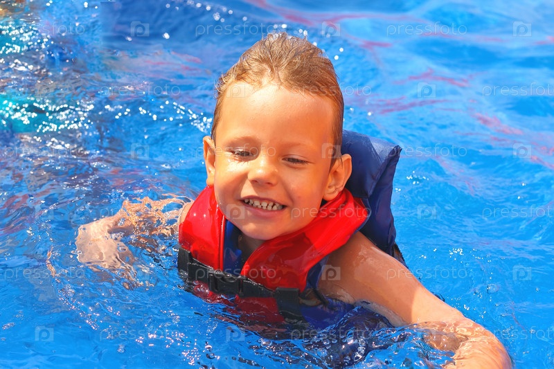 Ребенок в жилете в бассейне водного парка