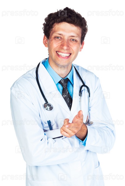 Улыбающийся доктор с пальцем вверх на белом фоне