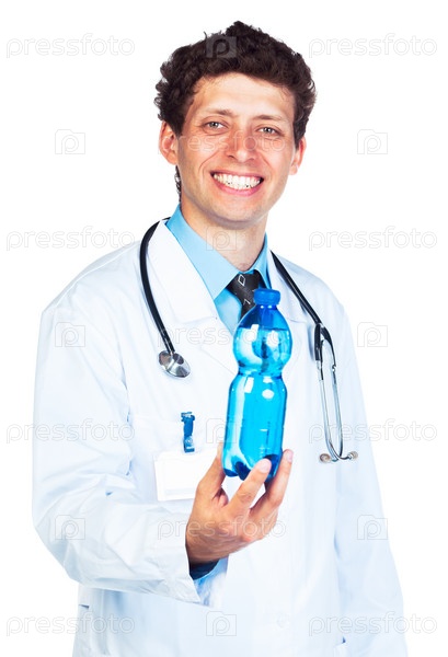 Доктор с бутылкой воды на белом фоне