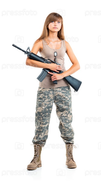 Красивая девушка, одетая в камуфляжную форму, с оружием в руке на белом фоне