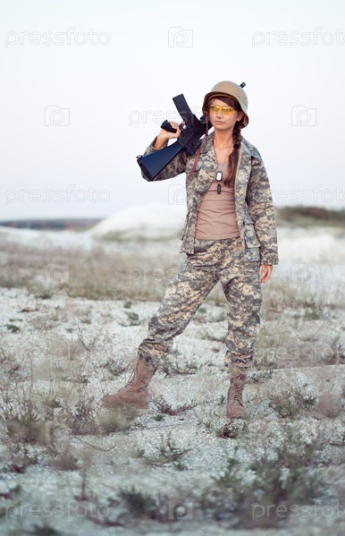 Молодая женщина-солдат в камуфляже с ружьем на открытом воздухе