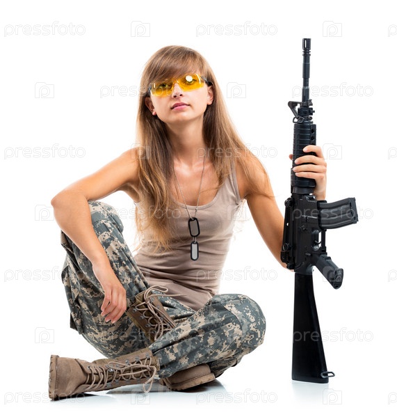 Красивая девушка, одетая в камуфляжную форму, с оружием в руке на белом фоне
