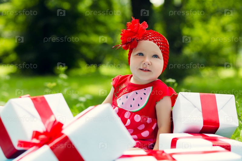 Радостная девочка с красочными подарочными коробками