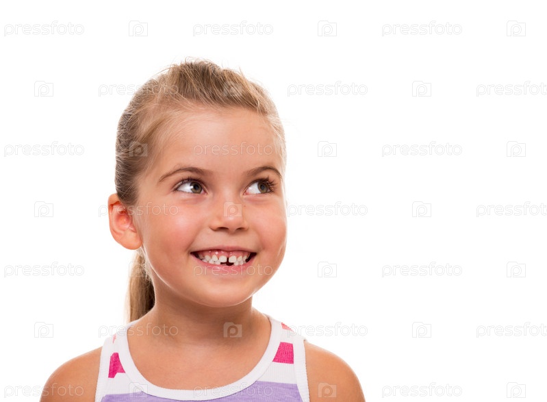 Маленькая девочка смотрит в сторону и улыбается, крупный план