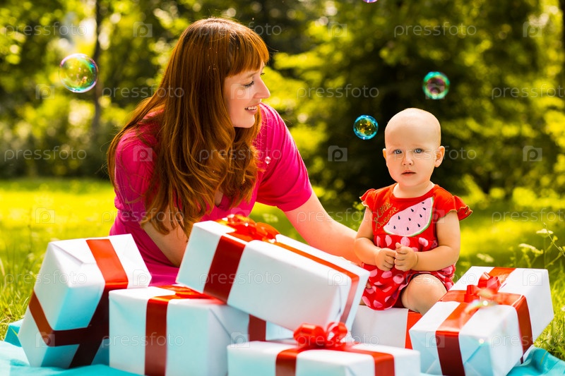 Ребенок и мать с подарочными коробками