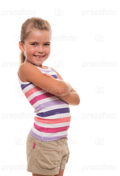 Маленькая девочка стоит на белом фоне
