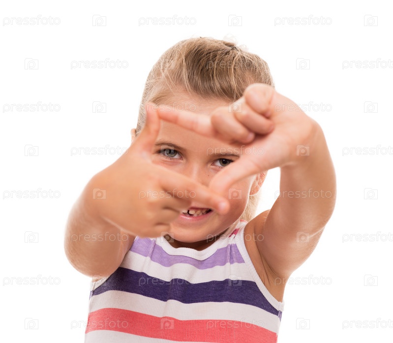 Маленькая милая девочка делает кадр из пальцев на белом фоне