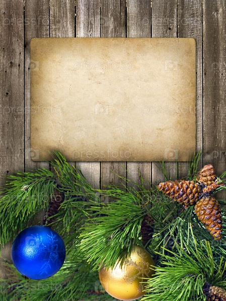 Карточка для поздравительной открытки с ветвями сосны и цветными шариками в винтажном стиле