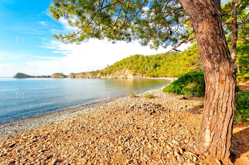 Ствол старый сосны на берегу моря в тихом заливе