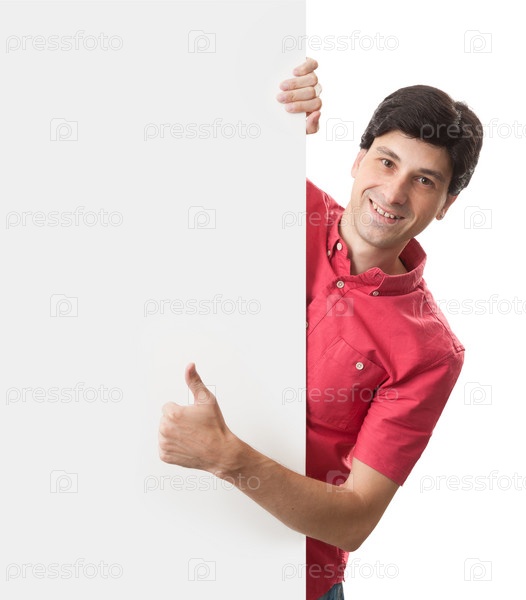 Счастливый молодой мужчина с баннером и поднятым большим пальцем