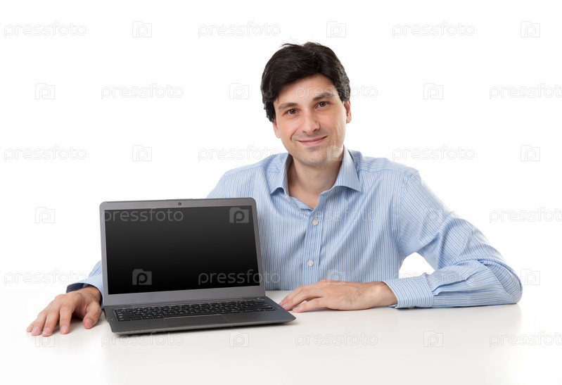 Улыбающийся бизнесмен с ноутбуком с пустым экраном