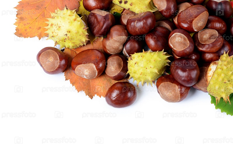 Каштаны на осенних листьях, изолированные на белом фоне