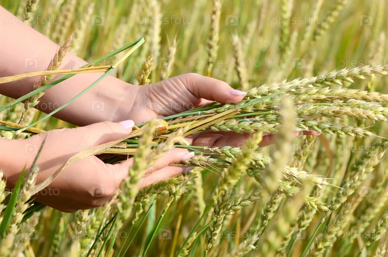 Женские руки с колосьями пшеницы на пшеничном поле