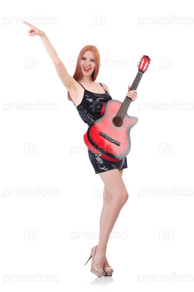 Женщина с гитарой, изолированная на белом фоне