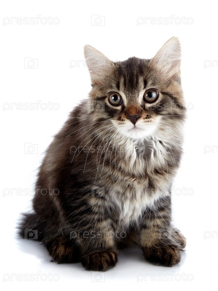 Полосатый пушистый котенок сидит на белом фоне