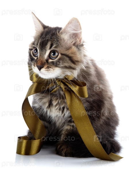 Полосатый пушистый кот с бантиком сидит на белом фоне