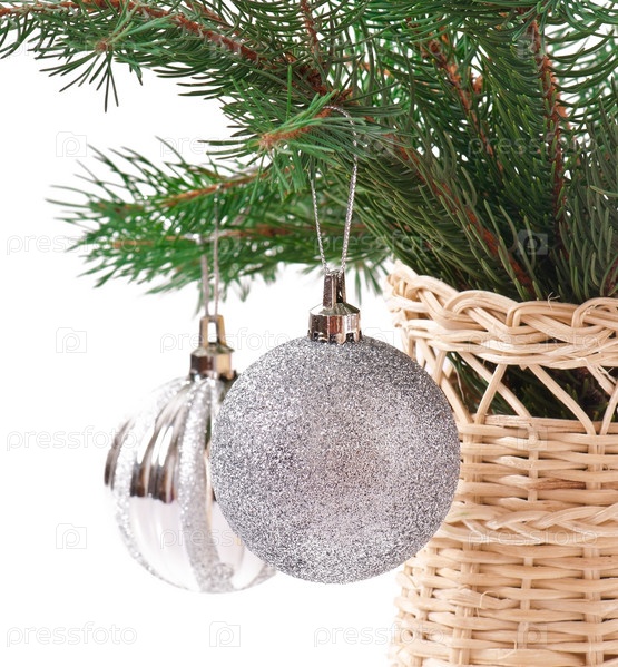 Елочный шар и зеленые ветки ели, изолированный белый фон