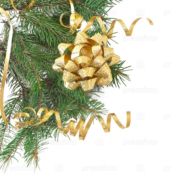 Зеленая сосновая ветвь и золотой бант на белом фоне