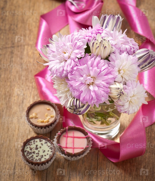 Красивый букет астр и конфеты на деревянном столе