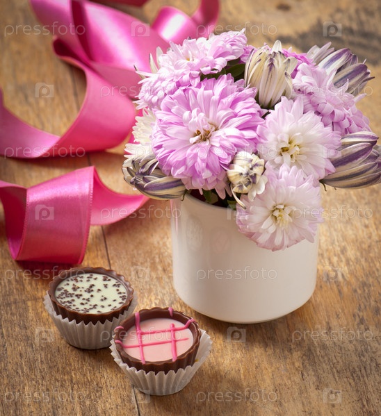 Красивый букет астр и конфеты на деревянном столе