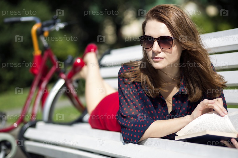 Женщина лежит на скамейке и читает книгу