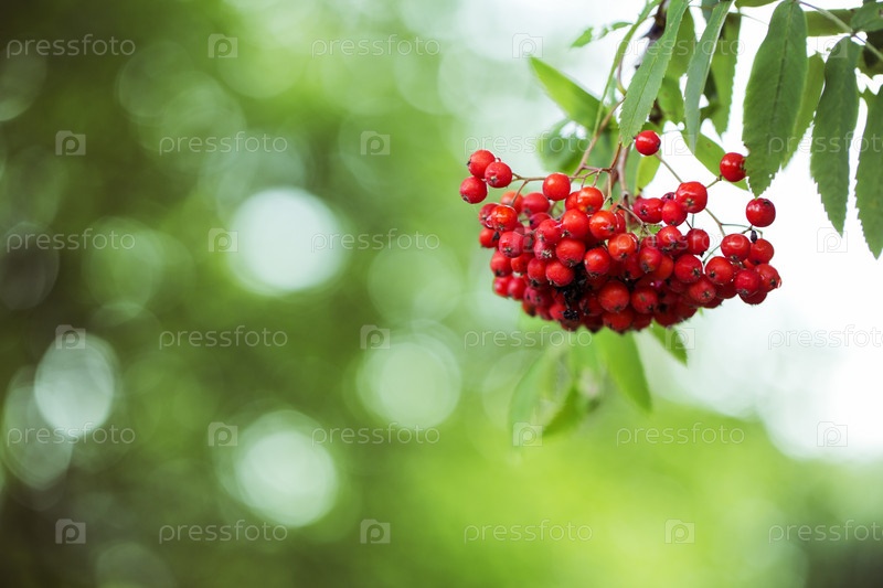 Гроздь спелой рябины висит на дереве