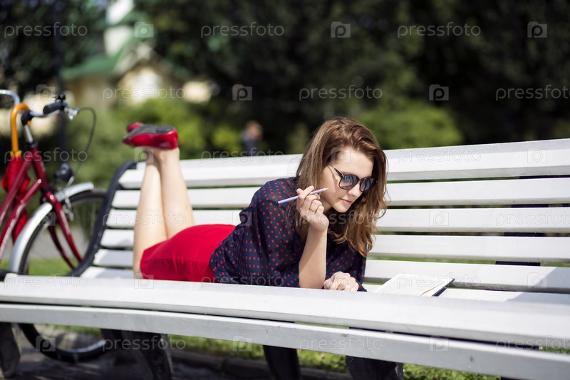 Женщина лежит на скамейке и делает записи