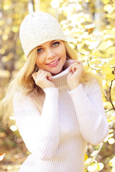 Молодая девушка в шапочке и свитере в осеннем лесу