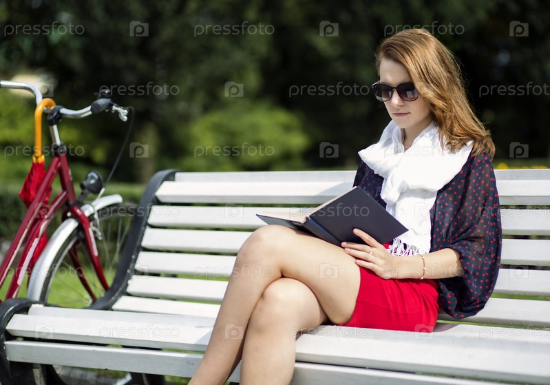 Женщина сидит на скамейке и читает книгу