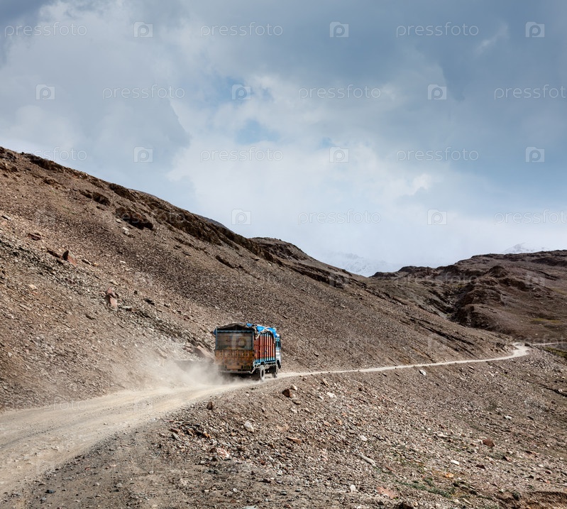Дорога Манали-Лех в индийских Гималаях и грузовик. Химачал-Прадеш, Индия