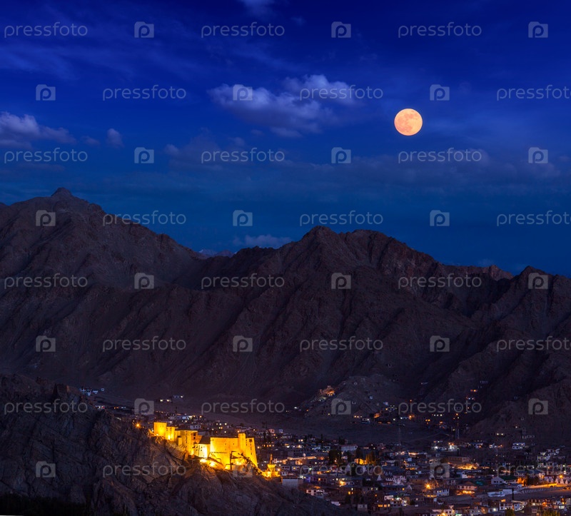 Ночной вид города Лех, дворца Лех и Гималаев. Ладакхе, Джамму и Кашмир, Индия