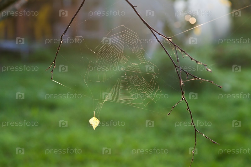 Осеннее солнце освещает паутинку с желтым листом