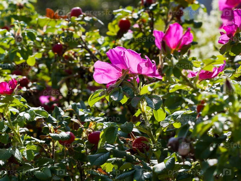 Заросли шиповника с розовыми цветками