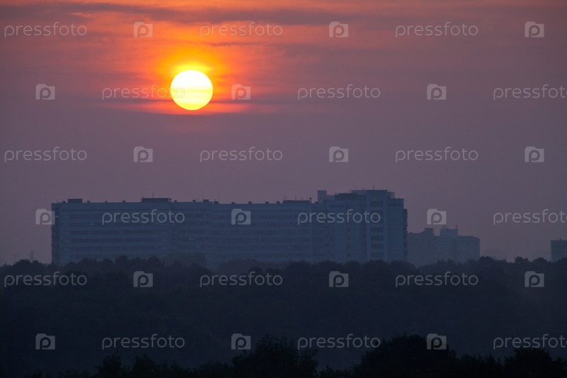 Большое красное солнце над городом