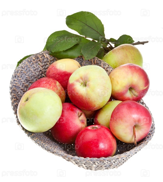 Красно-желтые яблоки в соломенной корзине, изолировано