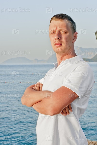 Мужчина с серьезным выражением на лице в закрытой позиции на фоне моря