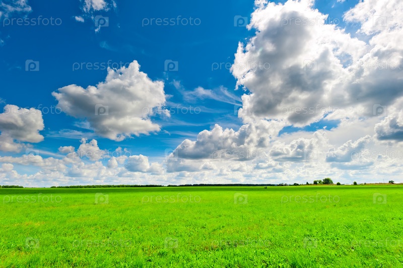 Красивые облака над зеленым полем в солнечный день