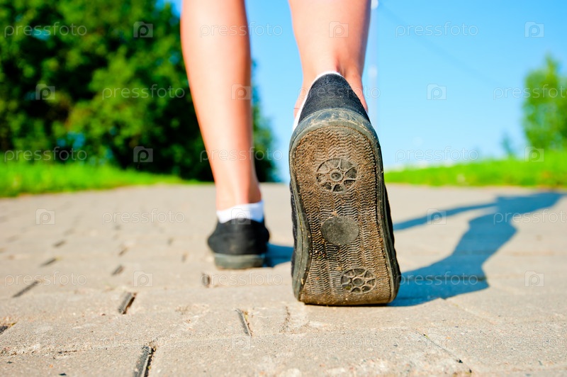 Женские ноги в кроссовках бегут по дороге в первой половине дня