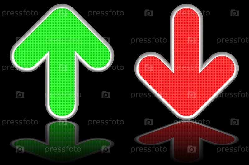 Зеленая и красная стрелки на блестящем черном фоне.Высокое разрешение, 3D-изображение