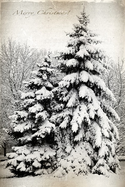 Рождественская ретро-открытка с деревьями и елками, покрытыми снегом, в парке