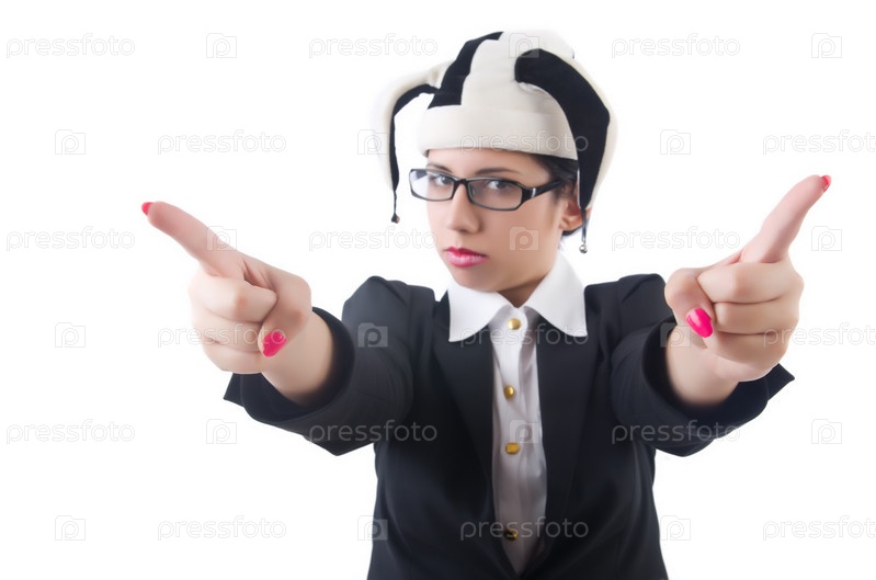 Бизнес-леди клоун, изолированная на белом фоне