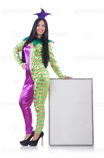 Клоун с пустым баннером на белом фоне