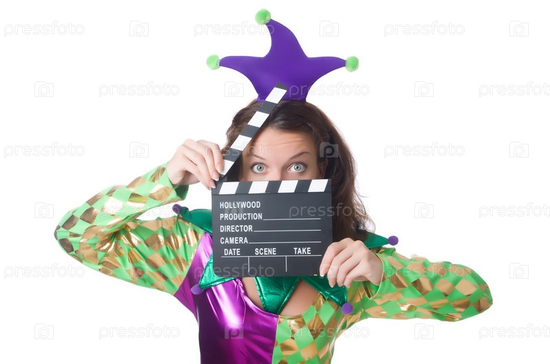 Клоун с кино-хлопушкой на белом фоне