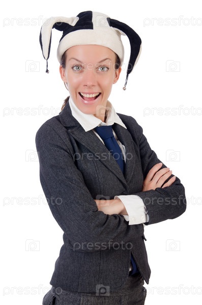 Бизнес-леди клоун, изолированная на белом фоне