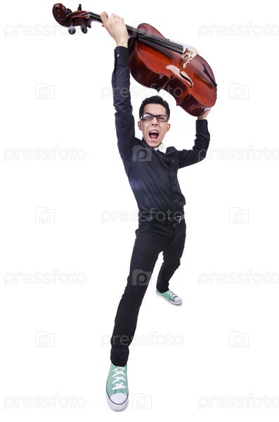 Забавный мужчина с виолончелью на белом фоне