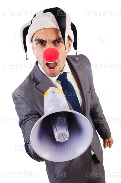 Бизнесмен клоун, изолированный на белом фоне