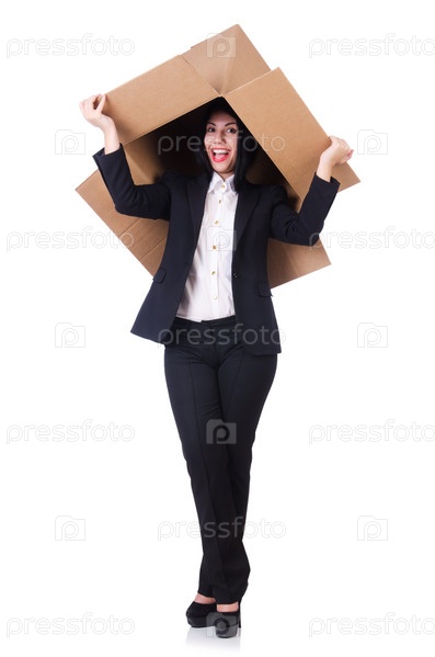 Женщина с большим количеством коробок на белом фоне