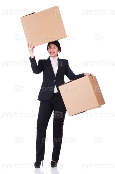 Женщина с большим количеством коробок на белом фоне